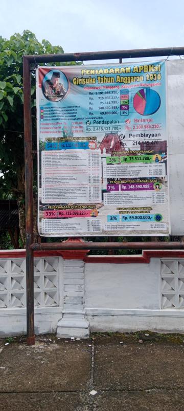 Girisuko (SIDA) - Anggaran Pendapatan dan Belanja Kalurahan (APBKal) Girisuko telah ditetapkan pada akhir Desember 2025. Dokumen ini memuat rencana penganggaran yang akan dilaksanakan di tahun 2026, baik rencana pendapatan, rencana belanja maupun pembiayaan.
